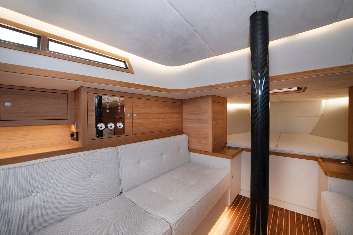 The pristine deck boasts seamless flush hatches and is adorned with EcoDeck® decking, a sustainable material crafted from renewable, solvent-free resins. At the end of its lifecycle, EcoDeck® can be effortlessly recycled.